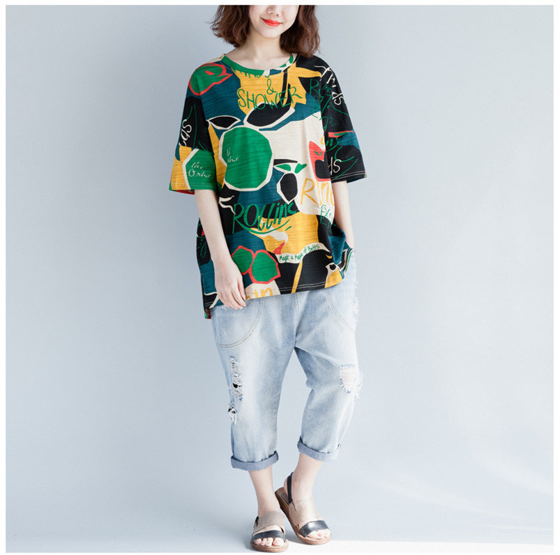 2018夏装新款韩版宽松大码休闲上衣潮 蝙蝠袖圆领印花短袖T恤女